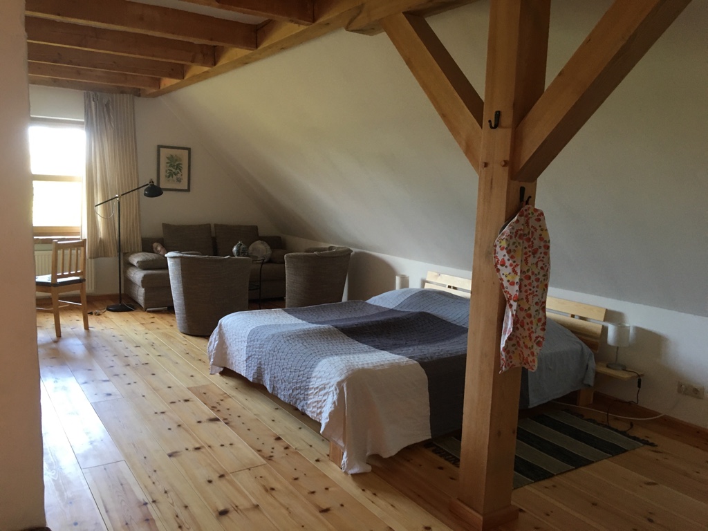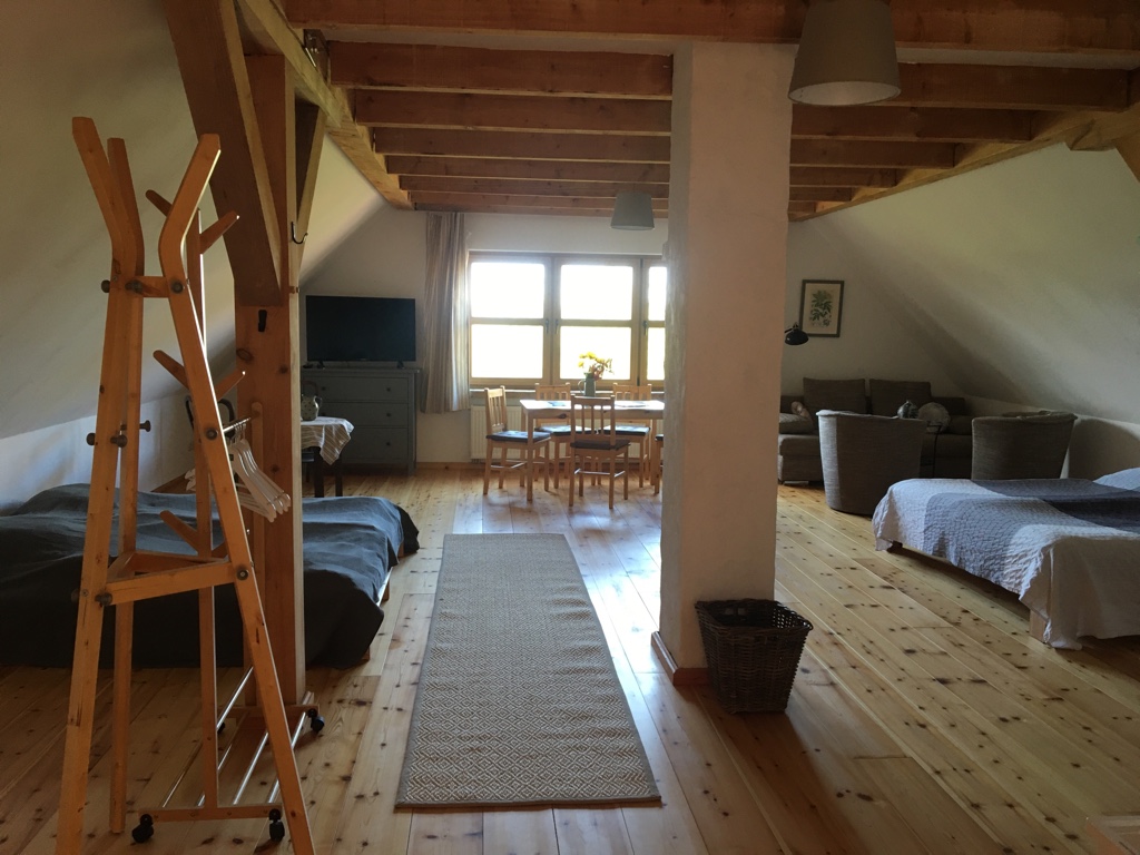 Schönes, helles sehr großes Appartement/Loft (70 qm) mit wunderschönem Blick in den Bauerngarten und in die Weite des Oderbruchs. Ausstattung mit viel Holz und liebevoller Einrichtung. Hier können maximal 3 Personen schöne Tage auf dem Hof verleben.